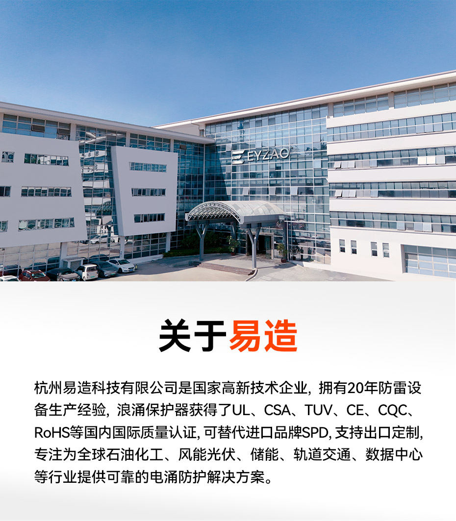 易造T1級浪涌保護(hù)器12.5kA-100kA規(guī)格型號齊全,嚴(yán)格執(zhí)行國內(nèi)國際各項(xiàng)標(biāo)準(zhǔn),獲得了UL、CSA、TUV、CE、CQC等多項(xiàng)權(quán)威認(rèn)證,確保了易造SPD在各種環(huán)境下的適用性和可靠性,可廣泛應(yīng)用于軌道交通、石油化工、港口碼頭、風(fēng)力發(fā)電、儲能系統(tǒng)、冶金、機(jī)場、醫(yī)院、煙草、市政等行業(yè)領(lǐng)域。