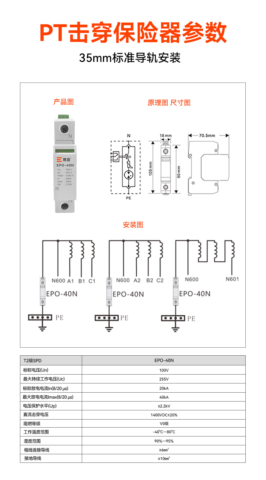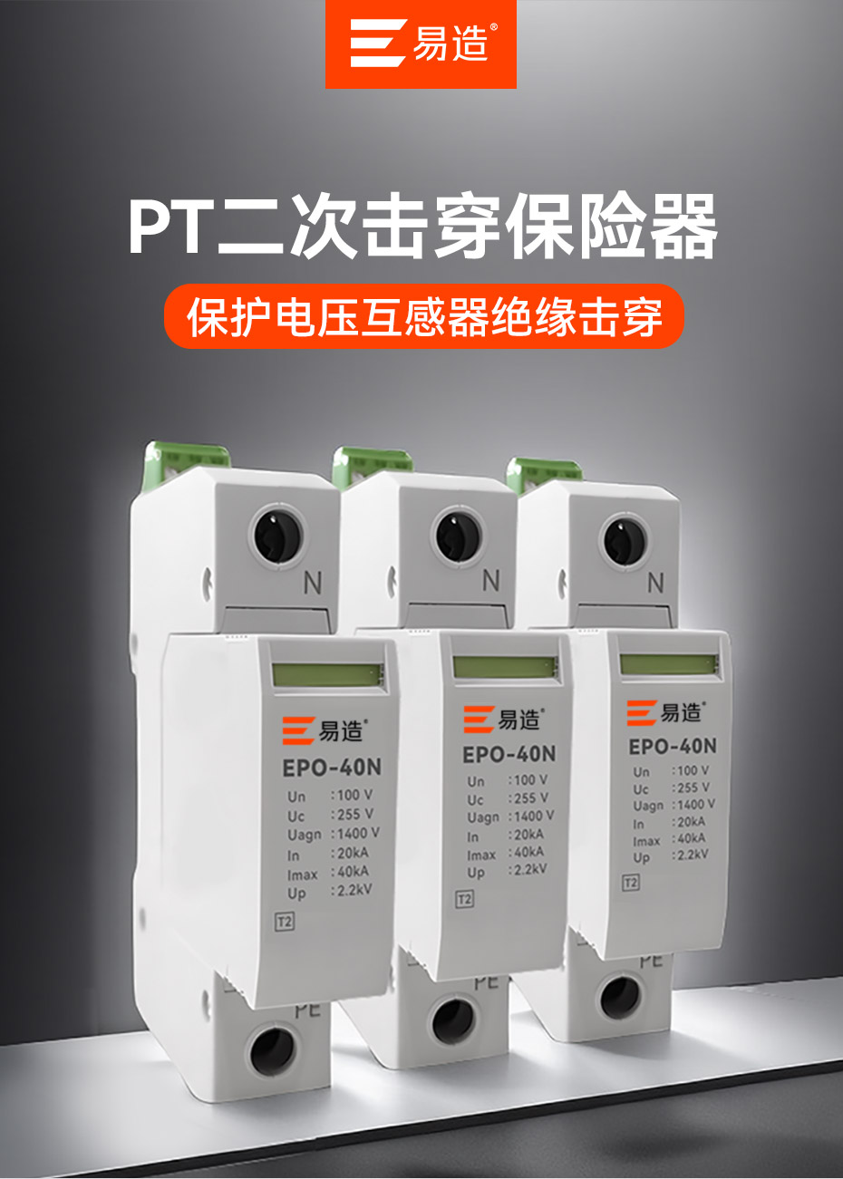 易造EPO-40N PT二次擊穿保險器應用于電力變配電站的PT電壓互感器柜二次側,當過電壓出現(xiàn)時,擊穿保險會迅速導通,呈現(xiàn)低阻抗對地通路,保護PT柜內電壓互感器和后端設備免受過電壓的侵害。