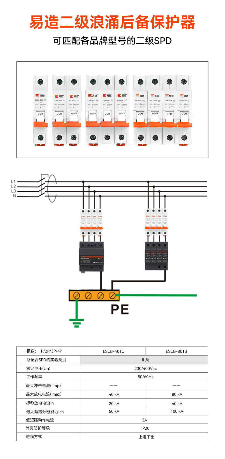 ESCB-80TB/40TC防雷后備浪涌保護(hù)器依據(jù)IECGB標(biāo)準(zhǔn)設(shè)計,采用主回路脫扣技術(shù),通常用于保護(hù)Imax80KA的浪涌保護(hù)器,可切斷100KA的短路電流,并且可在極短時間內(nèi)切斷3A以上的低短路電流,具有高短路分?jǐn)?/span>,低短路瞬動,電涌耐受能力高,殘壓低,尺寸小,可監(jiān)控等優(yōu)點,廣泛運用于配電柜,配電箱,低壓柜上.