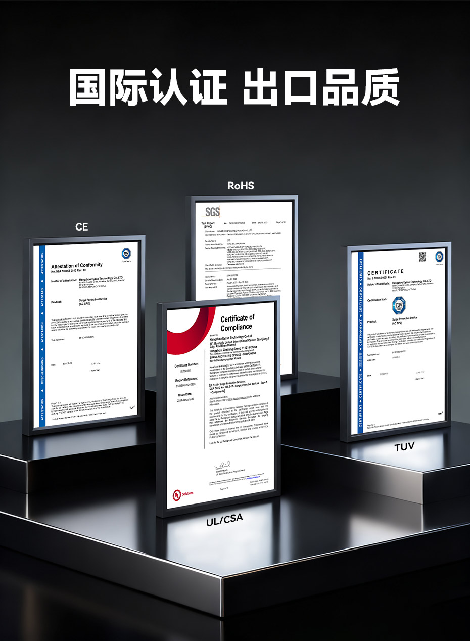 易造二級40kA插拔式浪涌保護器,最大持續(xù)工作電壓Uc涵蓋60Vac-1500Vac,用于電力系統(tǒng)的單相和三相防雷保護擁有UL/CSA、TUV、CE等國際質(zhì)量認證,符合全球市場的最高安全和ROHS歐盟環(huán)保標準,可替代進口品牌SPD,支持外貿(mào)出口。